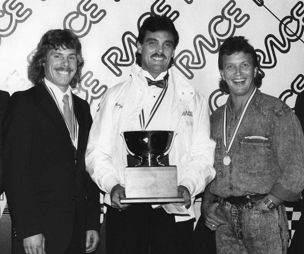 Steve Dick’s break through National win took place mid season 1988 at Shannonville Motorsport Park for the Molson Superbike Challenge National, where the Suzuki rider edged all the fast locals and dueled with favourite Rueben McMurter. Pictured on the podium after a late-race shower, (Left to Right) Norm Murphy, Steve Dick and Michel Mercier. [Photo: Colin Fraser]Opening RACE Regional of 1988, and now full time racer Steve Dick celebrates Shannonville success on his Decabois Office Furniture supported Suzuki GSX-R750J. [Photo: Colin Fraser]At the 1988 csbk National Superbike round at Westwood, Steve Dick takes his traditional inside line for the hairpin on the #101 Suzuki, while Steve Crevier looks outside on his #73 Yamaha. Crevier had won the weekend before at Calgary. [Photo: Colin Fraser]1988 featured one of the closest-ever series points battles for the CSBK series Pro Superbike class: pictured at Race City in Alberta, the #11 Don Knit Honda of Gary Goodfellow leads #24 Rothmans-Honda of Rueben McMurter, #87 Weld Rite Kawasaki of Norm Murphy, #73 Yamaha of Steve Crevier and the #101 Suzuki of Steve Dick. [Photo: Colin Fraser]Post season Castrol-Motoplan Nationals Banquet in Toronto with top Superbike points scores Steve Dick (third, Suz), National Champion for Rothmans-Honda Rueben McMurter and runner-up Don Knit Honda‘s Gary Goodfellow. [Photo: Colin Fraser]