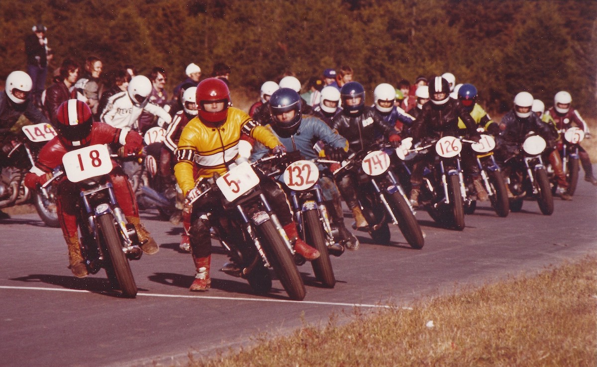 Jim Allen won the big race of the day for F-1 bikes on a cold day at Shannonville ‘76, aboard an Egli-Yamaha TZ750 two-stroke. 2015 Canadian Motorcycle Hall of Fame Inductee Allen crashed his TZ250 twice in a support event the same day and had the turn where both of his tumbles took place named after him!