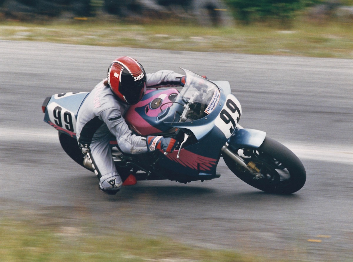The 1986 RACE National tour opened at Westwood Motorsport Park just east of Vancouver, British Columbia. The crowd favourite was undoubtedly local bike dealer Gary Goodfellow, a former M/Xer born in New Zealand. Goodfellow’s Suzuki GSX-R750 was decked out in Pink Flamingo livery, advertising his downtown scooter rental business geared for tourists at the Vancouver World’s Fair taking place at the time.