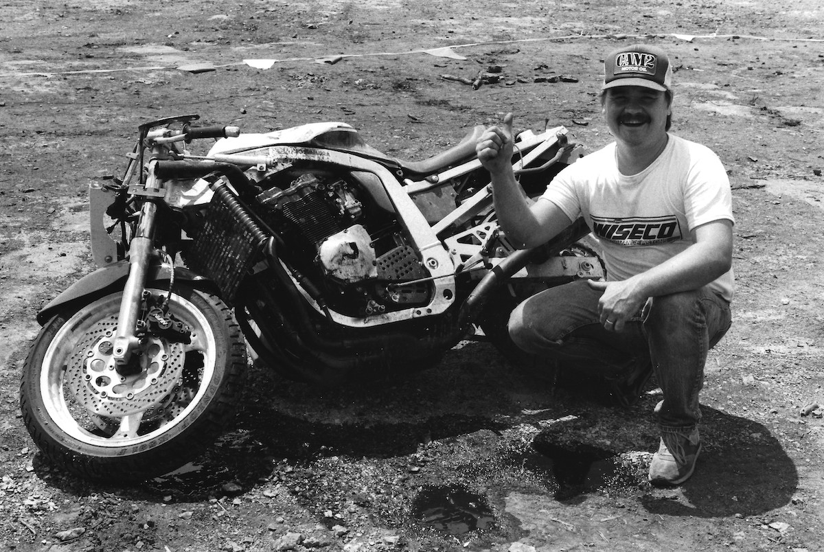 At the Molson Superbike Challenge National at Shannonville Motorsport Park in 1988, Friday practice didn’t go well for Suzuki’s established top gun Michel Mercier on his Pro Production class (note the stock pipes and treaded tires) GSX-R750. Mercier was involved in a collision coming off the back straight with another Suzuki, wrecking the points-leading production entry. Tuner Mike Crompton took a moment to pose with the debris before returning to work on the factory Superbike. Team manager George Morin was despatched to Toronto with Crompton’s pick up truck to get a new GSX-R750, and by evening they were piecing together their support class entry under lights in the paddock.