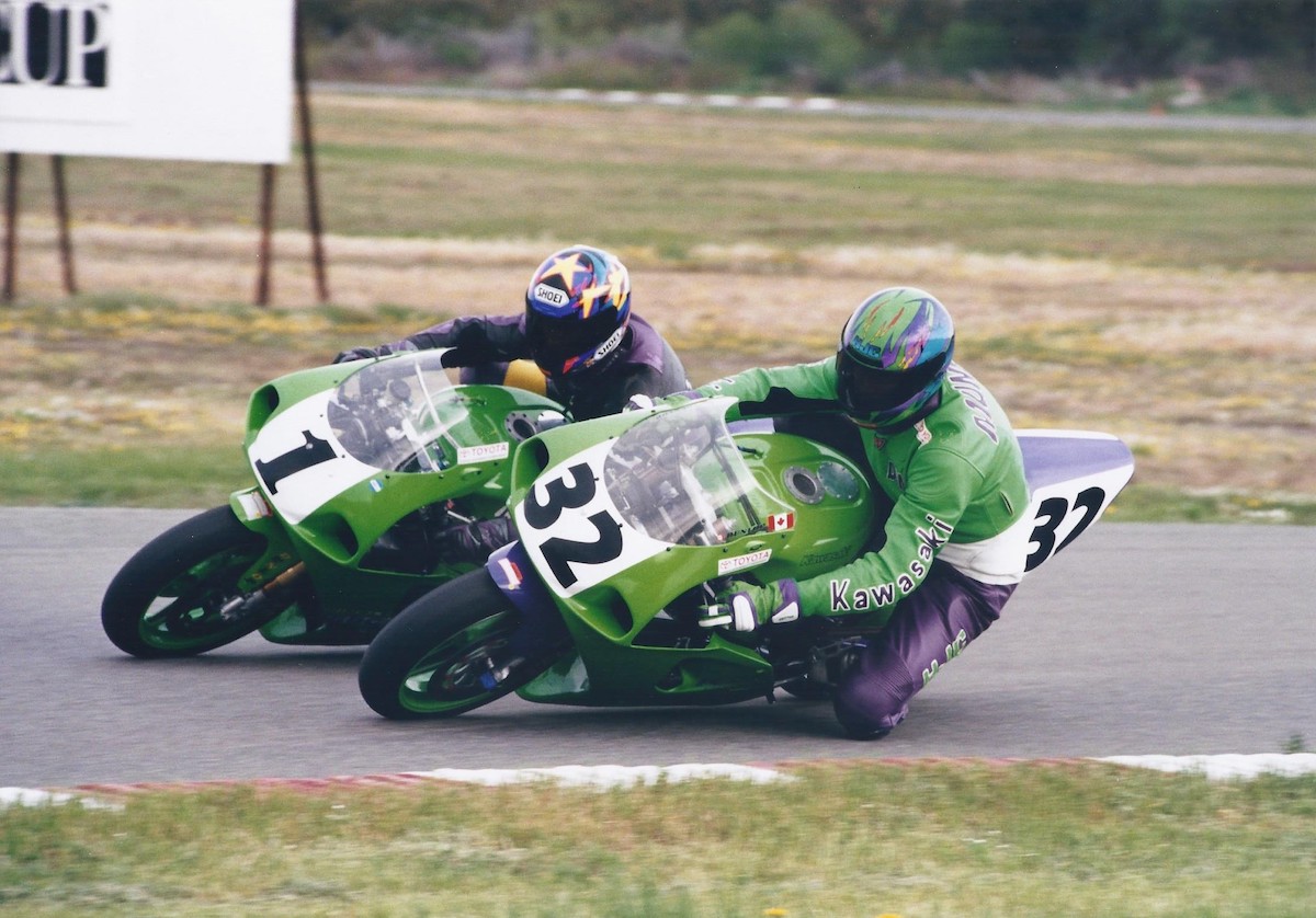 Today’s image is from the Shannonville National opener in 1997, back when Saturday Heat Races set the grid for Sunday’s Finals. In an image often considered staged for Kawasaki, Champ Taylor battles side-by-side through turn eight with rival Don Munroe (Kawasaki # 32) in a heat race battle for the lead. The two ZX-7RR racers were the class of the era’s field, and usually locked in a fight for first.