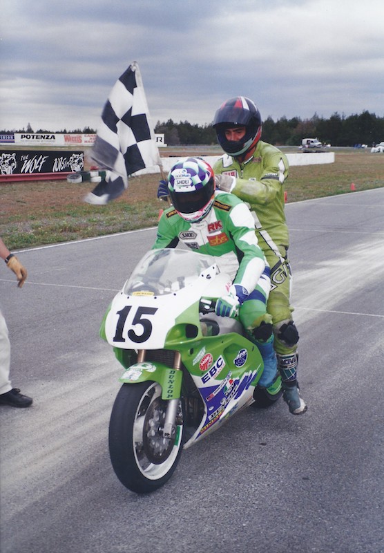 Today’s image celebrates the last race of the 1994 Canadian road racing season, the WERA Six Hour National Endurance round at Shannonville Motorsport Park. Taylor had already clinched his first overall National Championship, and for the WERA race teamed with fellow works Kawasaki racer and long time friend and rival Don Munroe to win the rare American National (in Canada) for the Canadian Kawasaki Motors Squad. Here, Munroe takes Taylor for a Ninja victory lap on the 15 turn S.M.P. “Long Track.”