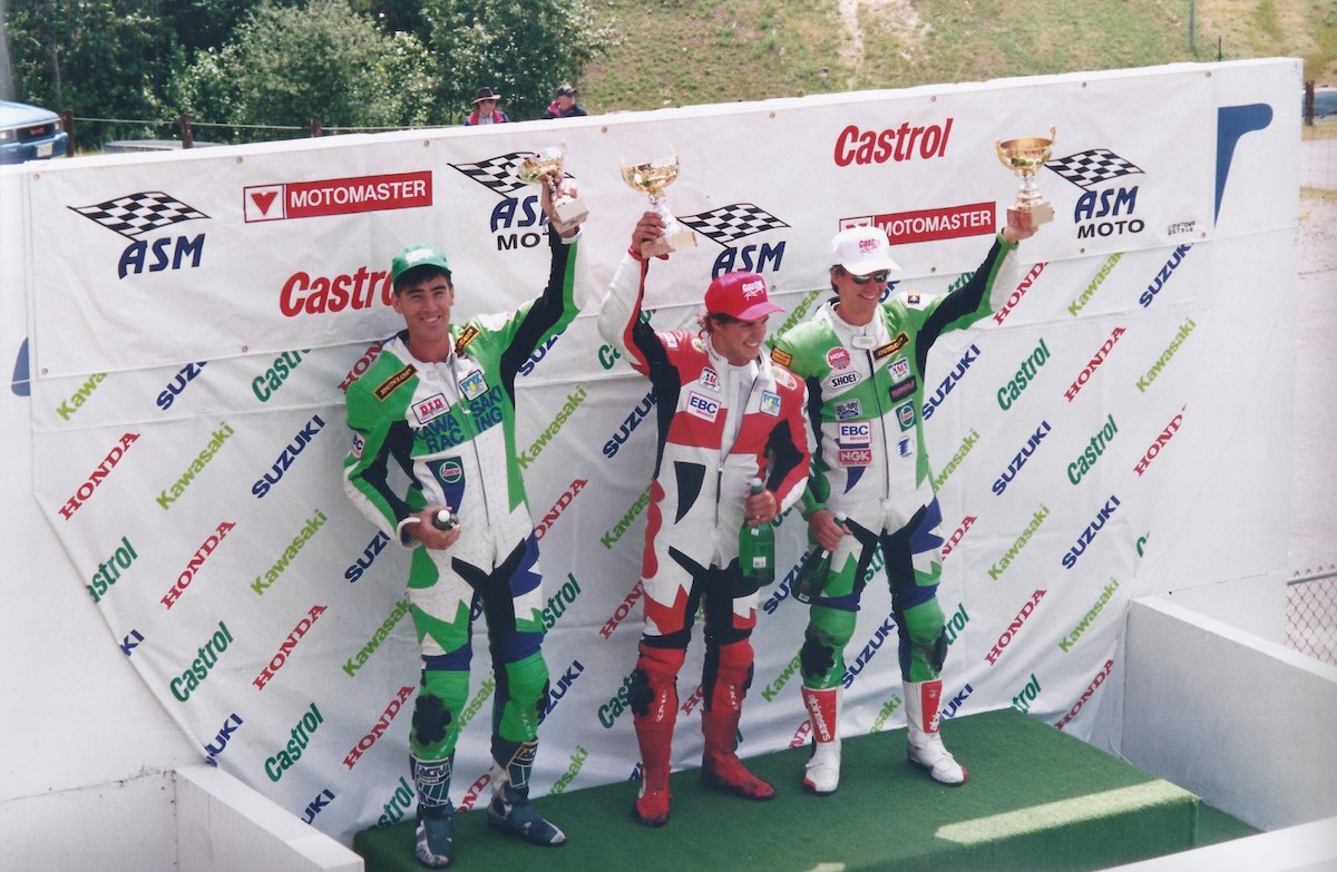 Today’s image is from the Mosport International CSBK National race in July of 1995. Taylor stands to the left, runner-up to victor Jeff Sneyd (centre) and Don Munroe (right). Sneyd took a surprise victor for the SuperShow Ducati team, after out-duelling the Kawasaki duo of Taylor and Munroe at the venue now know as Canadian Tire Motorsport Park.