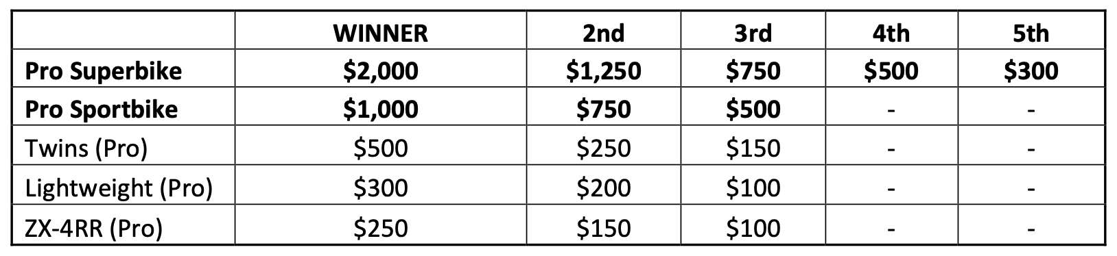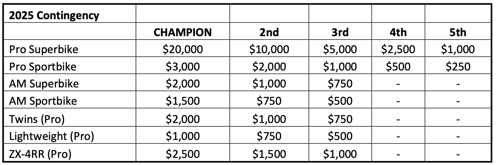 Championship contingency will be paid for all pro classes, plus Amateur Superbike and Amateur Sport Bike. Those prizes are: