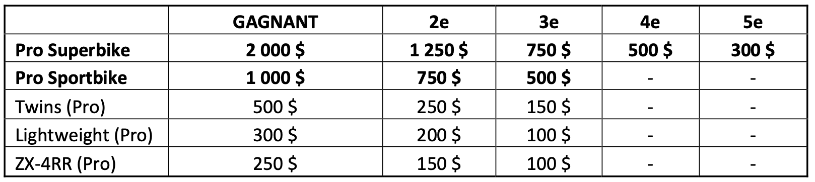 MKC paiera une prime par course dans les classes professionnelles seulement. Ces primes sont:
