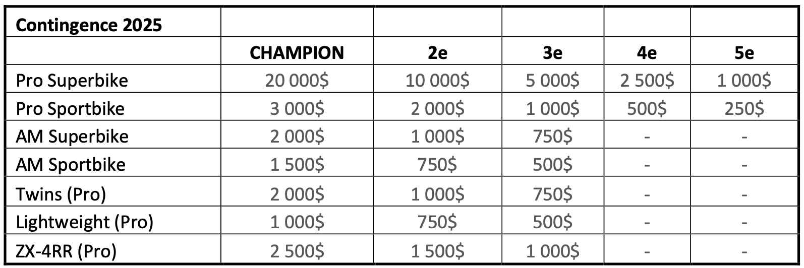 Les prix de contingence du Championnat canadien de Superbike 2025 offerts par Kawasaki sont: