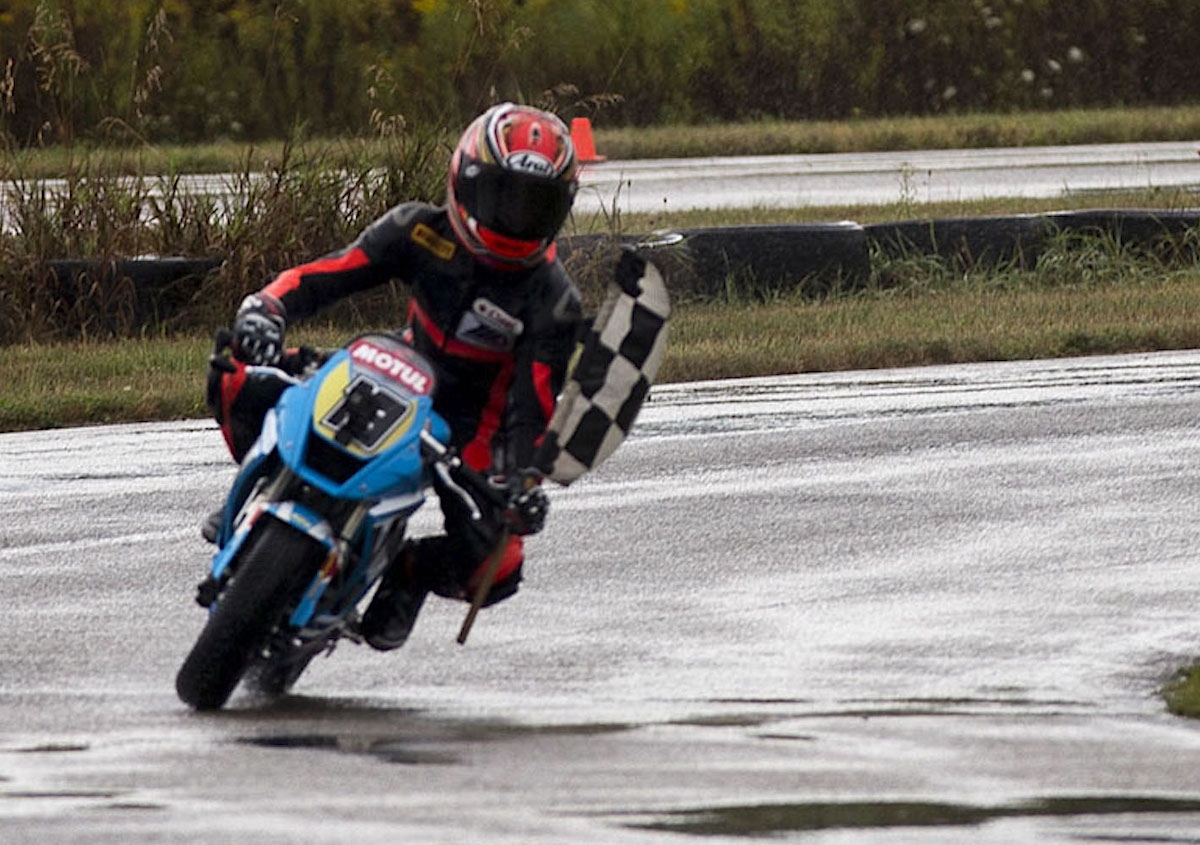 One of the best stories of the day, however, was in the combined Sport-3 and Moto-3 category, where Nathalie Vezeau elected for slicks in the wet conditions – and amazingly won a thrilling battle over Mike Mann and third-place finisher Brandon Stevens.