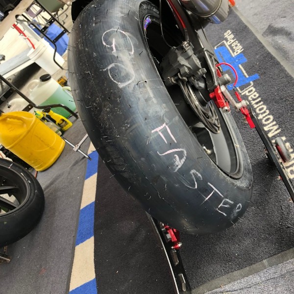 The key decision for the race was which Dunlop rear compound to use. The medium would be sure to go the distance. The soft would provide additional grip and faster laps at the beginning of the race but performance would likely begin to fall off before the end of the race. After discussions with tire supplier Sandy Noce (Pro 6 Cycle), the team decided that soft compound would provide the best chance to stick to the leaders during the opening laps and that the longevity of the medium wouldn’t be much of an advantage if Michael’s pace suffered too much at the start of the race