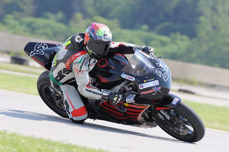 Starting on the second row of the Mopar Superbike Feature race Frank could see a clear path to the lead! that was the plan but not the result! A “grabby” clutch meant a good start was impossible instead a rather quick trip backwards and when all was said and done Frank entered the back straight away for the first time in 8th place (from his 4th place qualifying position), passing seasoned Pro’s on fast super bikes on a track this narrow and all of them on new tires! its just about an impossible task “we needed to get a good start, get out with the lead bunch and push hard while the tires were still fresh, the bike grabbed, wheelied, grabbed again … it was all over as quick as it started” By mid race the top 3 had a terrific fight going for the win meanwhile Frank was doing his best to run a solid pace and pass as many bikes and riders as he could, at the end of the crash shortened 20 lap race Frank had a solid 5th place, a little less than wanted but a great finish and a nice return to Canadian National Super Bike Racing.
